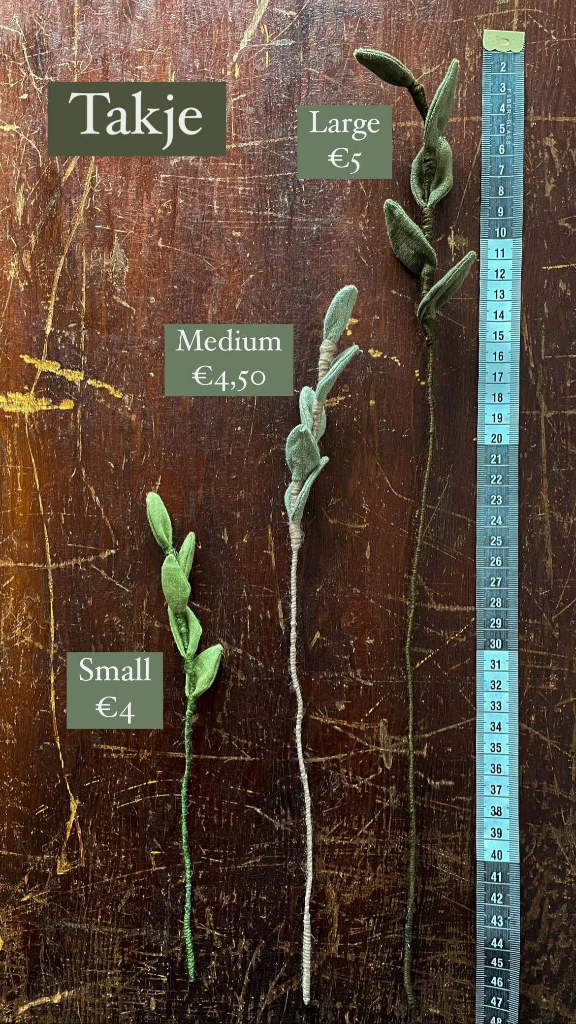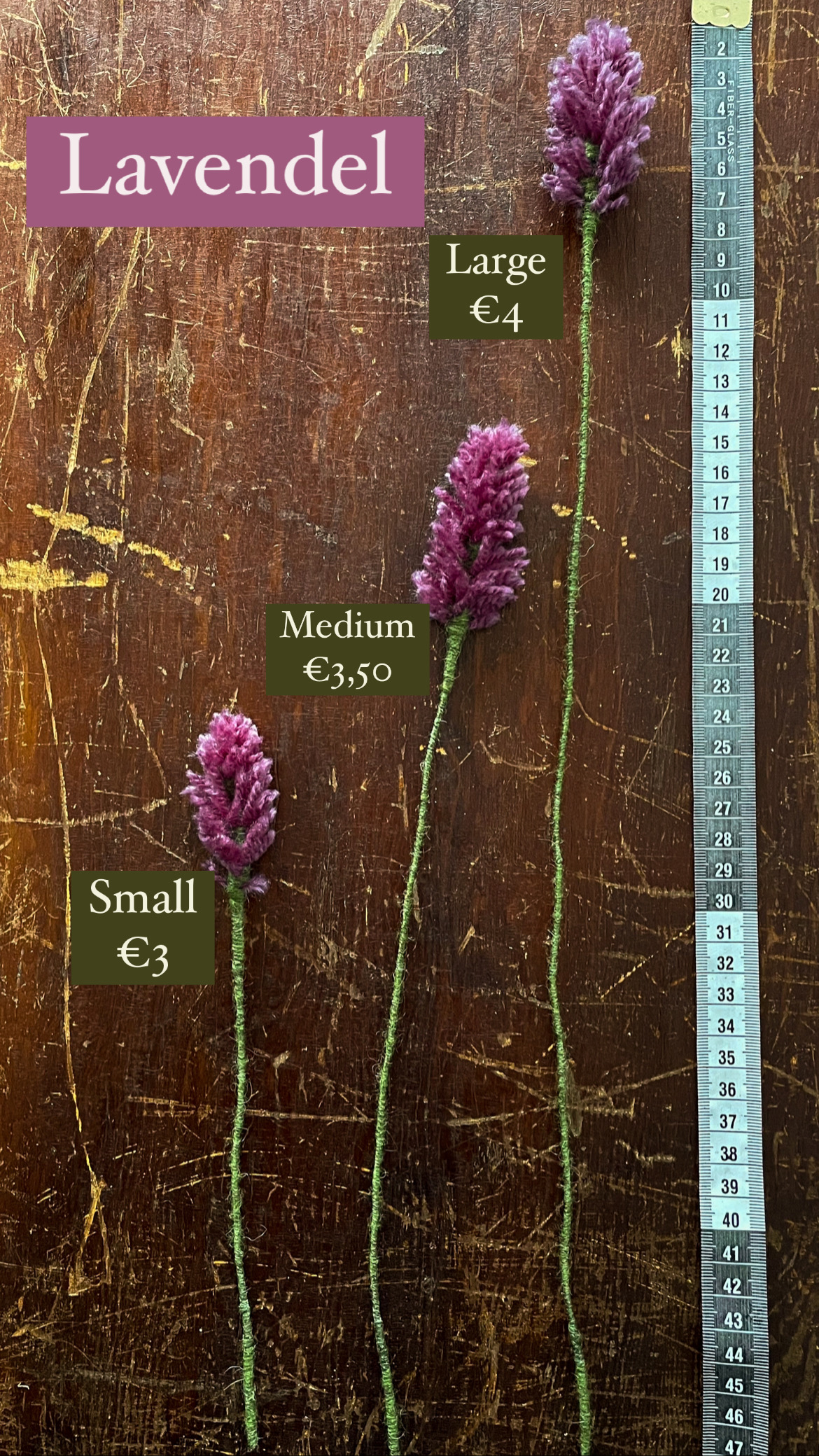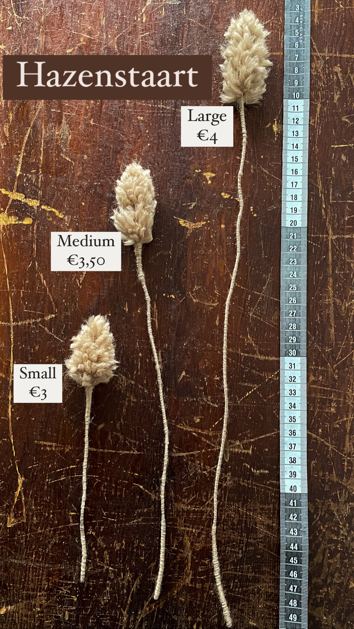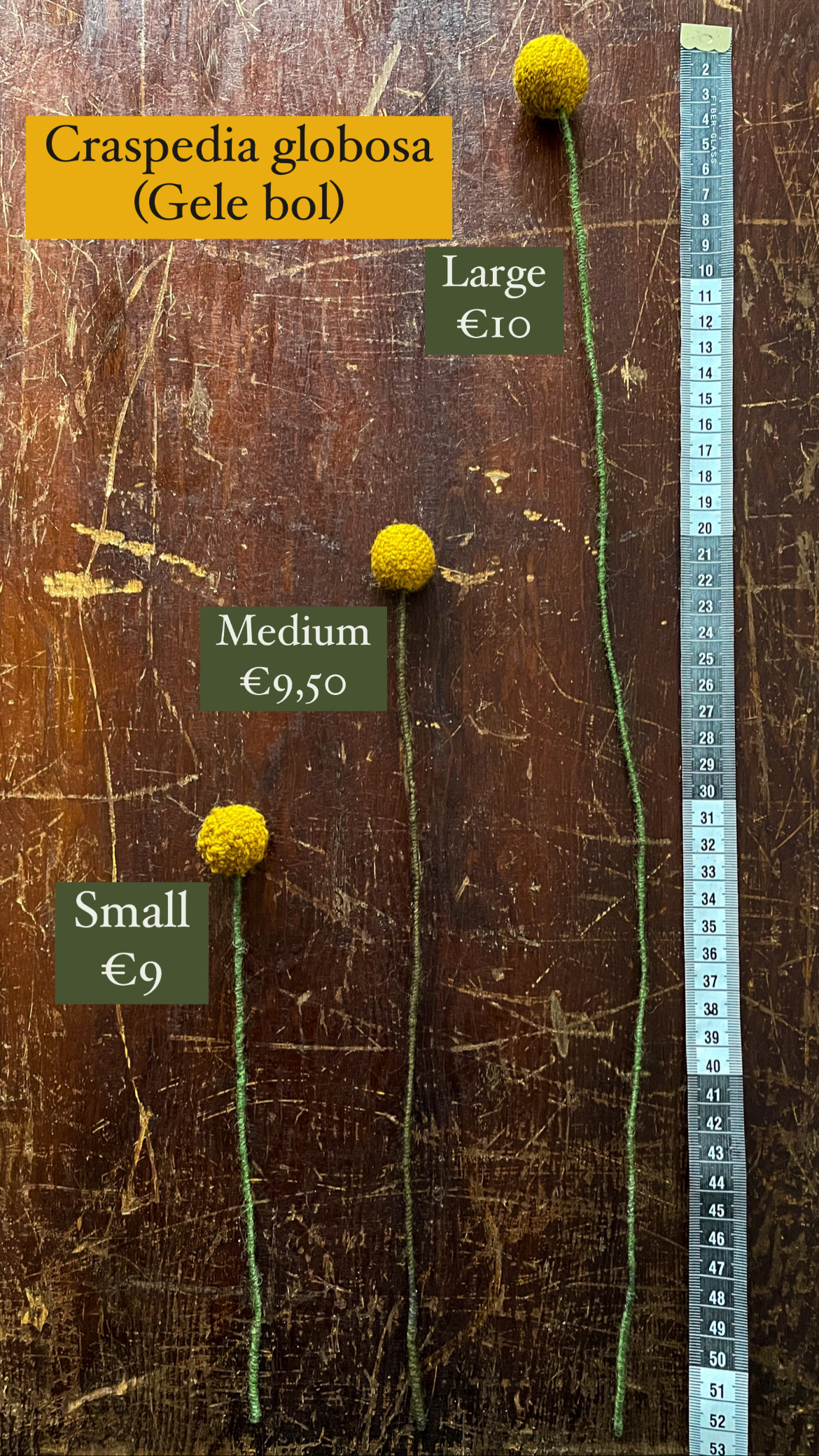 Het meetlint geeft een indicatie van de afmetingen van de verschillende formaten – Small, Medium, Large. Binnen deze formaten zijn veel verschillende kleine maatafwijkingen, zodat de bloemen leuk te combineren zijn in een vaas. Het combineren van de verschillende formaten is ook mogelijk, afhankelijk van de beoogde vaas.